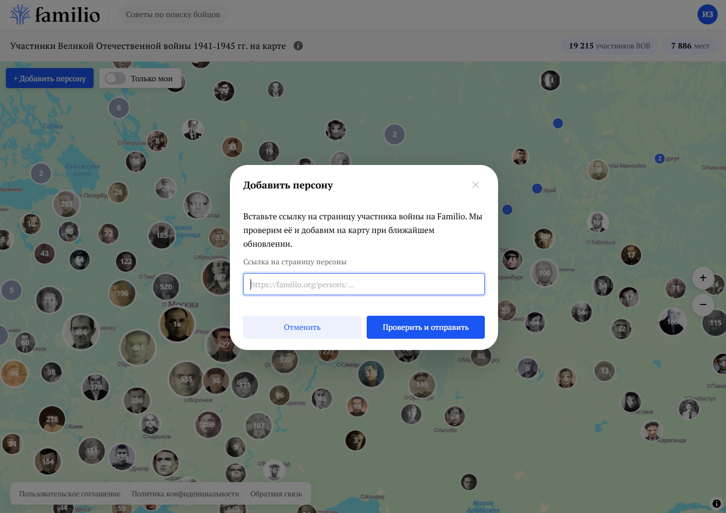 Рис. 4. Карта участников Великой Отечественной войны на Familio. Как добавить персону