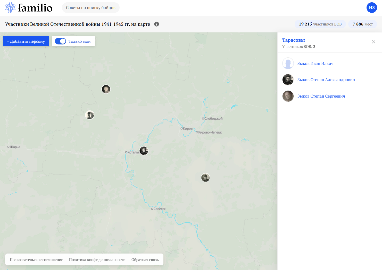 Рис. 2. Карта участников Великой Отечественной войны на Familio. Вид «Только мои». На примере карты Ивана Зыкова