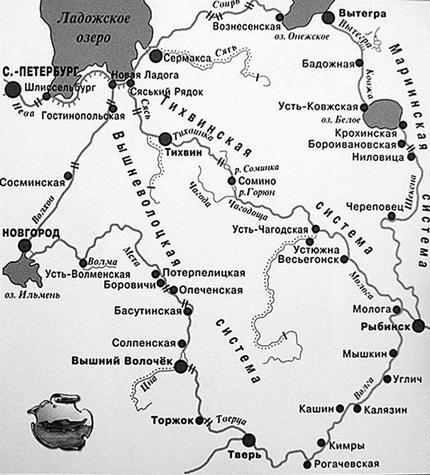 3. Мариинский (1766 г.): Самый северный маршрут, использовавшийся осенью 1766 г. Транспорты шли через Шлиссельбург, Ладогу, поднимались по реке Свири, проходили через Онежское озеро и по рекам Вытегре и Ковже добирались до Рыбинска. Позже на его основе была построена знаменитая Мариинская водная система.