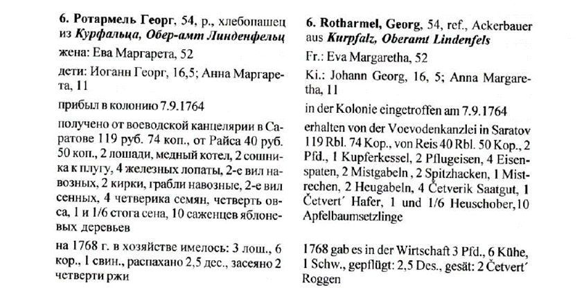 Яркой иллюстрацией служит запись о семье Георга Ротермеля, водворившегося в колонии Севастьяновка (Антон). Для обзаведения хозяйством семья получила значительную поддержку: от Саратовской воеводской канцелярии – 119 рублей 74 копейки, от асессора12 Рейса – еще 40 рублей 50 копеек, а также натуральную помощь, включавшую двух лошадей, медный котел, сельскохозяйственный инвентарь (сошники, лопаты, вилы), семена, фураж и даже 10 саженцев яблонь. К 1768 г., всего через несколько лет после прибытия, семья Ротермелей уже распахала 2,5 десятины земли, засеяла рожь и владела небольшим, но растущим хозяйством: три лошади, шесть коров и свинья. Этот пример наглядно свидетельствует как о масштабе государственных инвестиций, так и о скорости, с которой колонисты налаживали быт на первоначально пустынных землях.