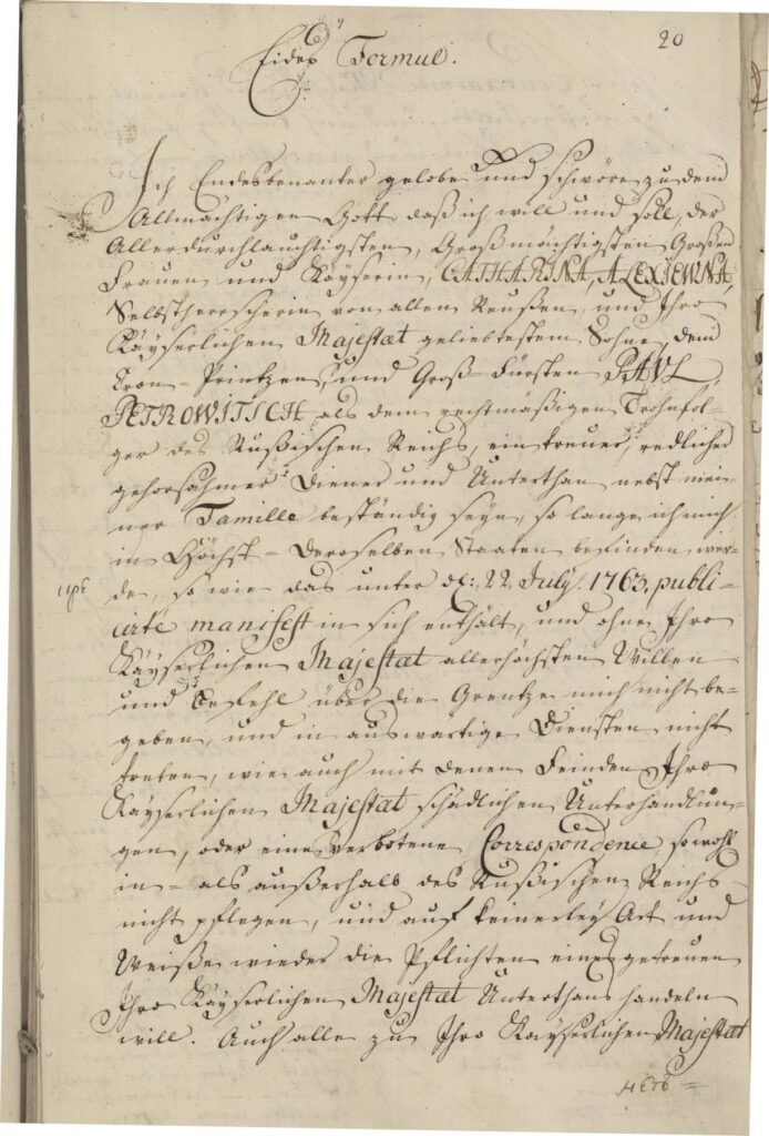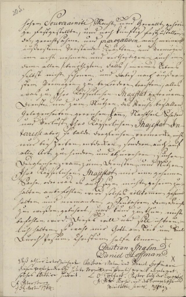 Торжественная клятва. Важнейшим условием, открывавшим доступ к государственным пособиям, была присяга на верность императрице Екатерине II и наследнику престола. Текст присяги («клятвенного обещания»), утвержденный самой государыней и переведенный на немецкий язык (хотя и с некоторыми смысловыми отличиями от русского оригинала), зачитывался пастором в церкви (Рис. 6).