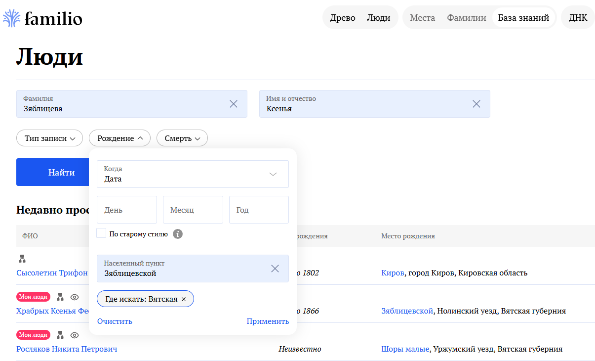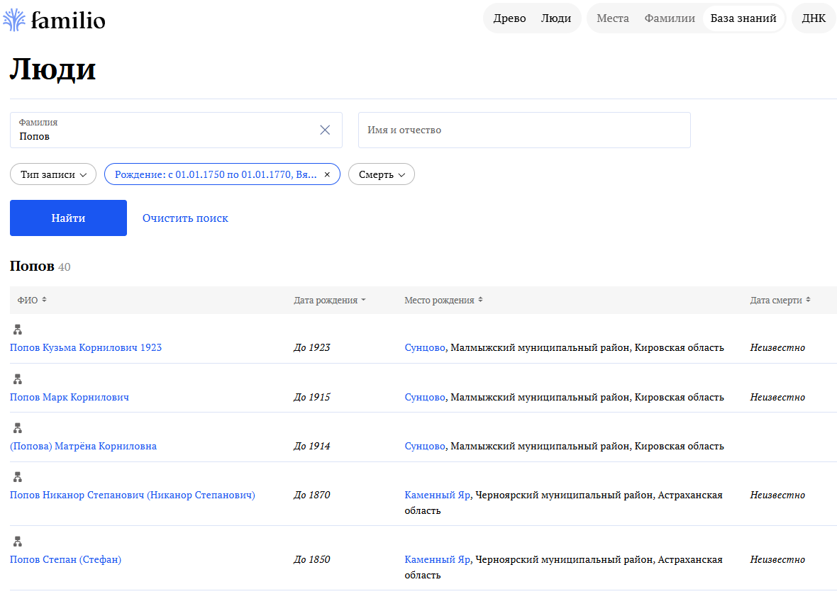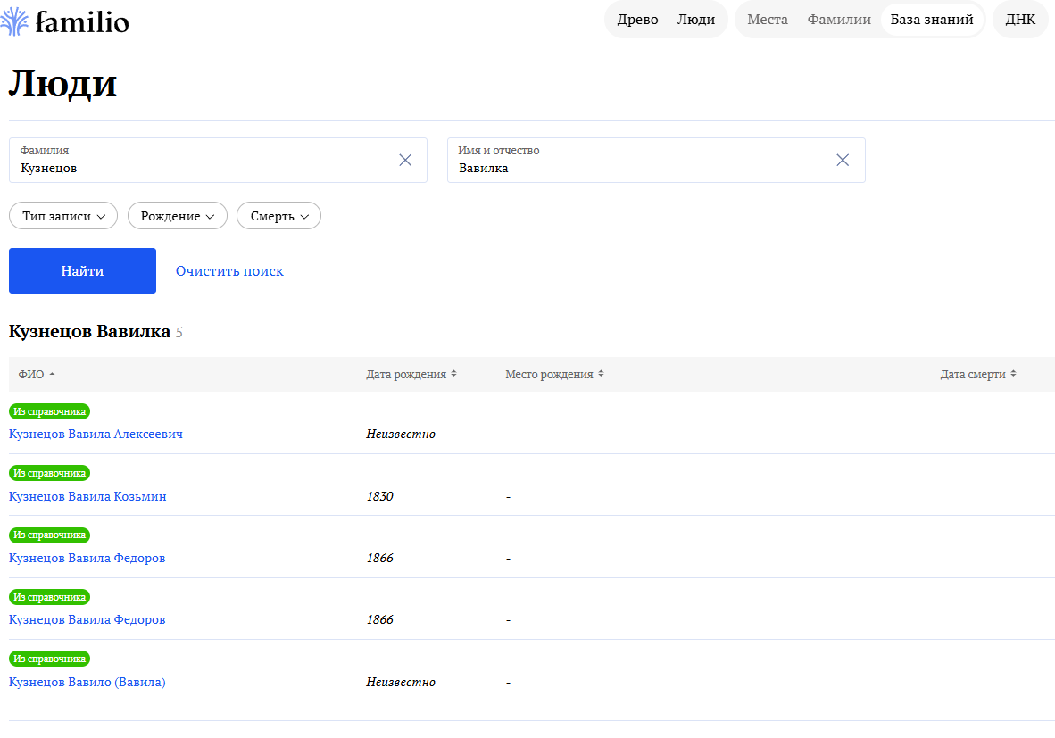Можно просмотреть отдельно свои персоны, записи из справочников и персоны других пользователей. Выберите одну или несколько категорий, и поиск станет точнее.