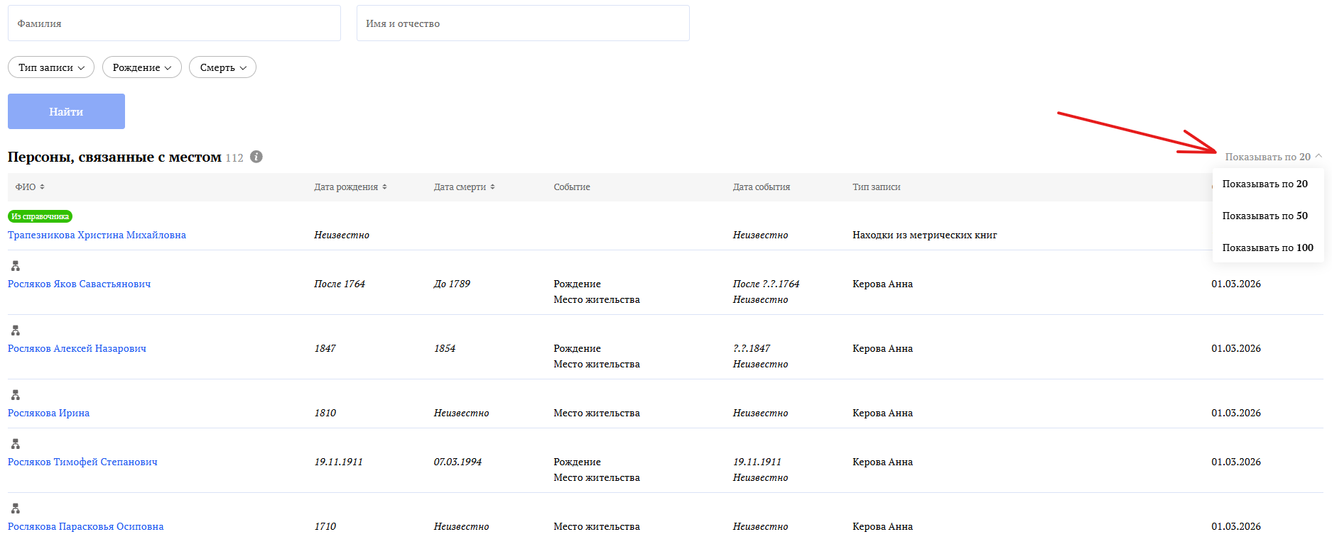 Список можно отсортировать по ФИО, дате рождения, смерти или дате обновления страниц персон.