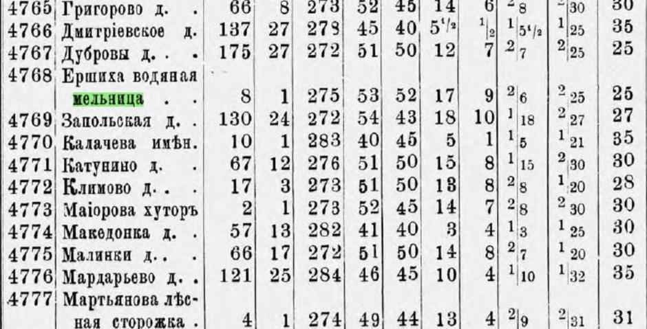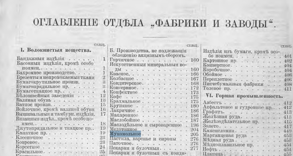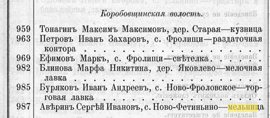 В частности «Вся Россия: Русская книга промышленности, торговли, сельского хозяйства и администрации. Торгово-промышленный адрес-календарь Российской империи». Издание содержит наименования, адреса, имена владельцев огромного количества фабрик, заводов и торговых предприятий Российской империи. Справочник нерегулярно издавался с 1895 по (предположительно) 1913 годы. Например, владельца мельницы-уроженца одной из «своих» деревень я нашла в томе 1 за 1899 год, раздел «Фабрики и заводы».