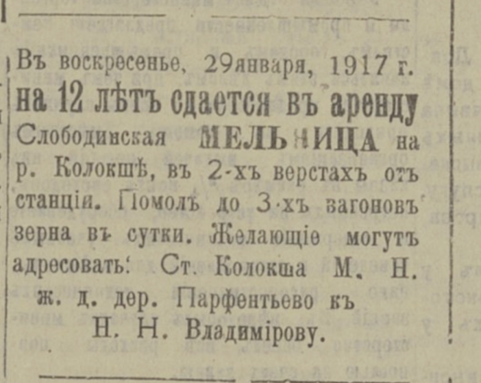 В местных газетах стоит поискать информацию о мельницах и мельниках, хотя это не всегда легко доступно и достаточно кропотливо. Например, объявление о сдаче нашей мельницы в аренду случайно нашлось, когда Владимирская областная библиотека оцифровала номера за 1917 год газеты «Старый Владимирец». Поиска по тексту там нет, поэтому только листать и просматривать. Интересна для изучения газета «Призыв».