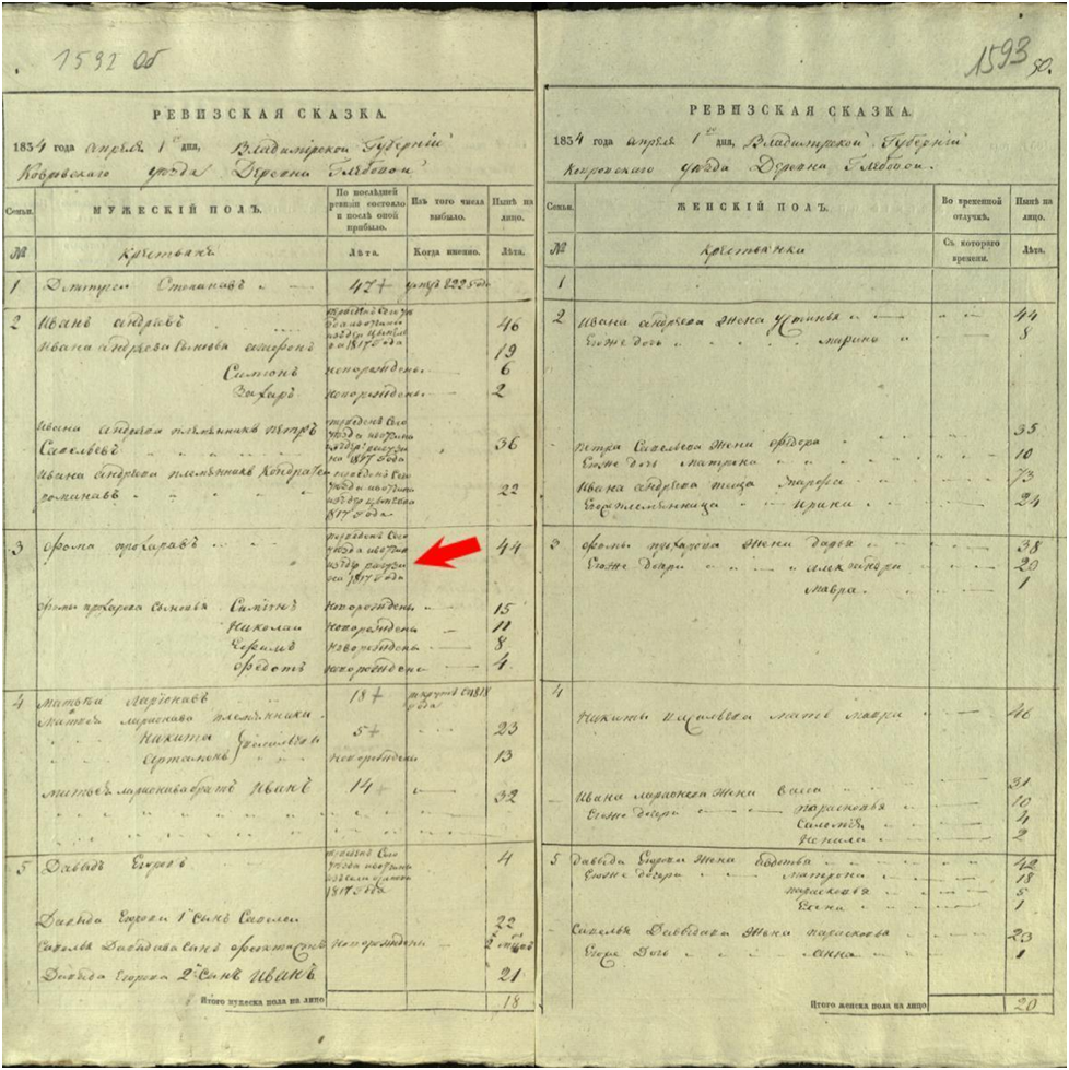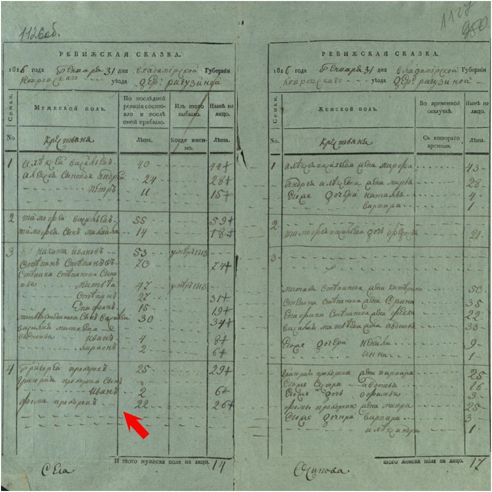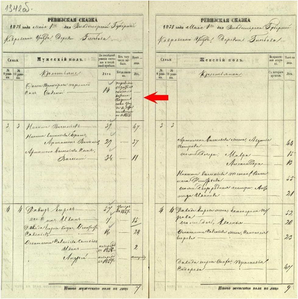 Другой сын Фомы, Савелий Прохоров, был отдан в зятья4, как следует из записи, в деревню Алешино, расположенную рядом с селом Сарыево. По состоянию на 10-ю ревизию я нашел его живущим в этой деревне с семьей и детьми. Дальше пока я их судьбу проследить не смог, потому как мало оцифрованных документов.