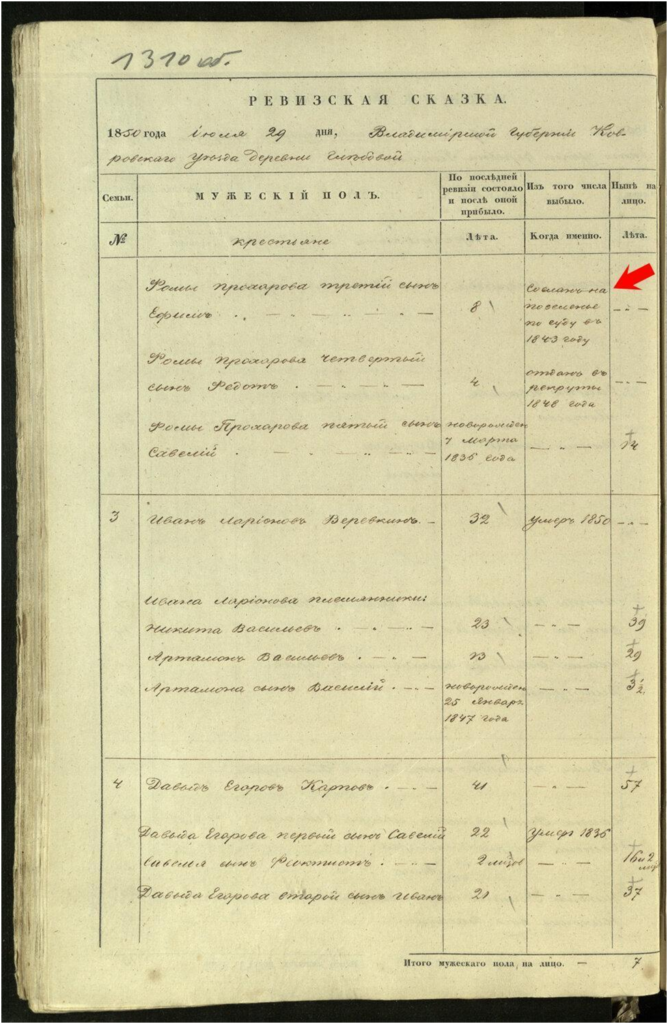 У Фомы Прохорова было 11 детей. В их числе сын Ефим Прохоров, которого, как следует из ревизской сказки, в 1843 году сослали на поселение по суду. В чем была его вина, пока не выяснил. Я планирую осенью посетить ГАВО, чтобы посмотреть несколько дел, которые, возможно, помогут раскрыть тайну.